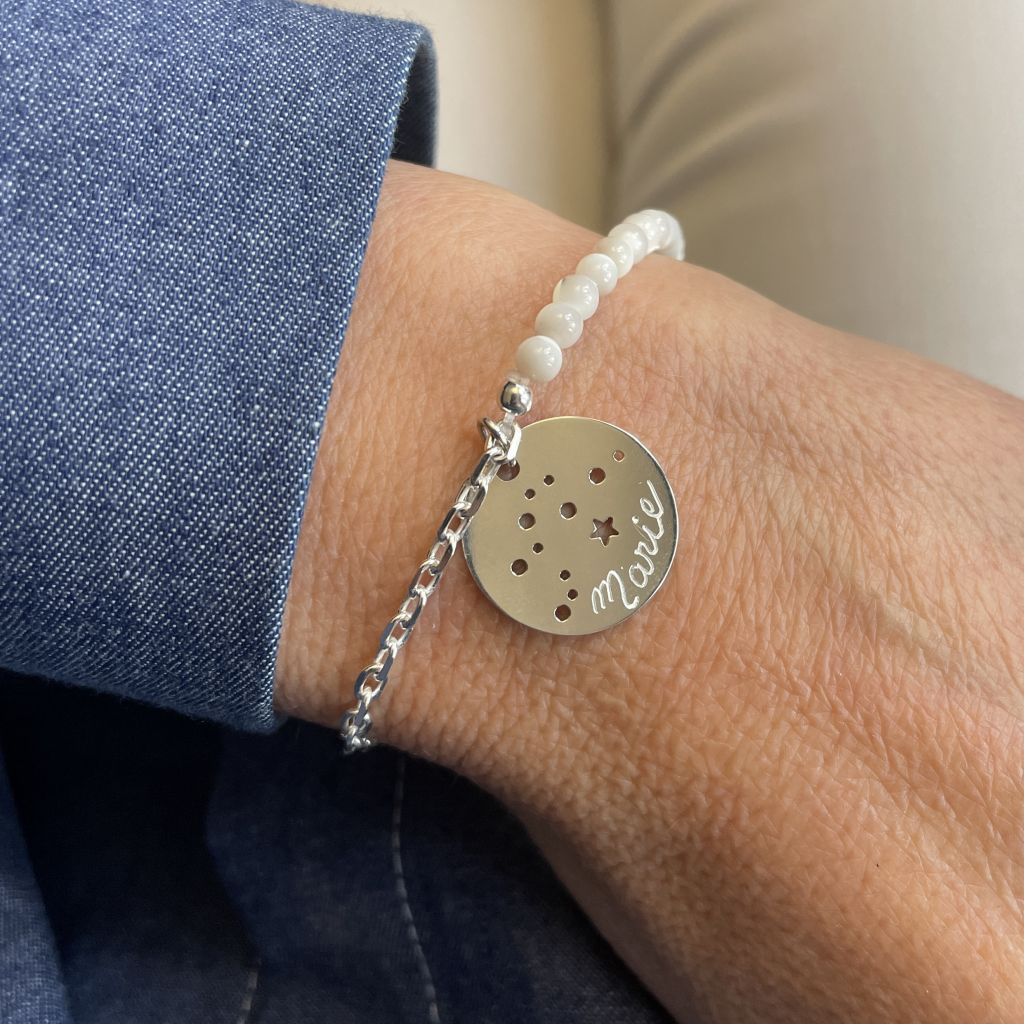 Bracelet chaîne en argent et perles de culture, finition par mousqueton plus chaînette ajustable. Merci de m'indiquer la taille exacte de votre poignet dans les commentaires, j'adapterai le bracelet en fonction. Médaille constellation, signe au choix. Possibilité de graver la médaille constellation.