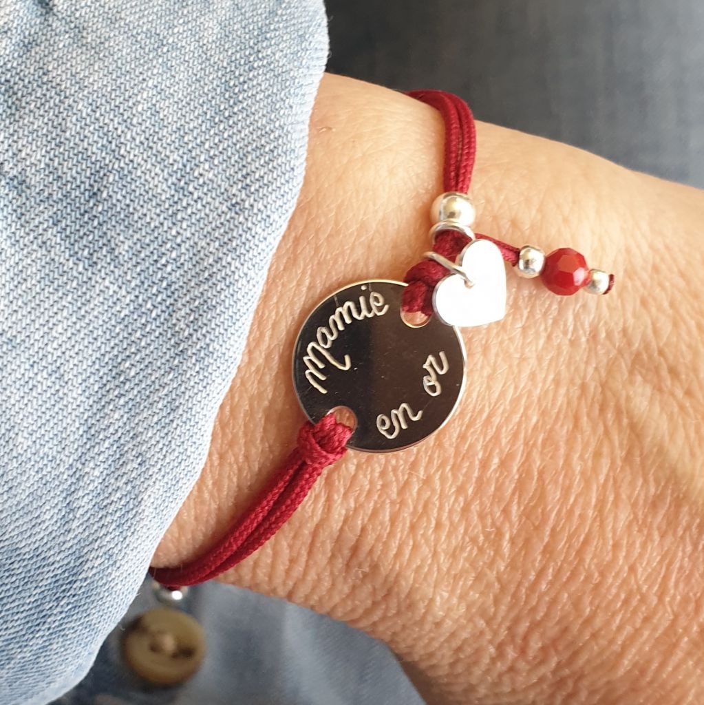 Bracelet mamie en or jeton 15 mm Gravure au choix, pompon coordonné au cordon Possibilité d'ajouter des mini médailles et un petit fermoir