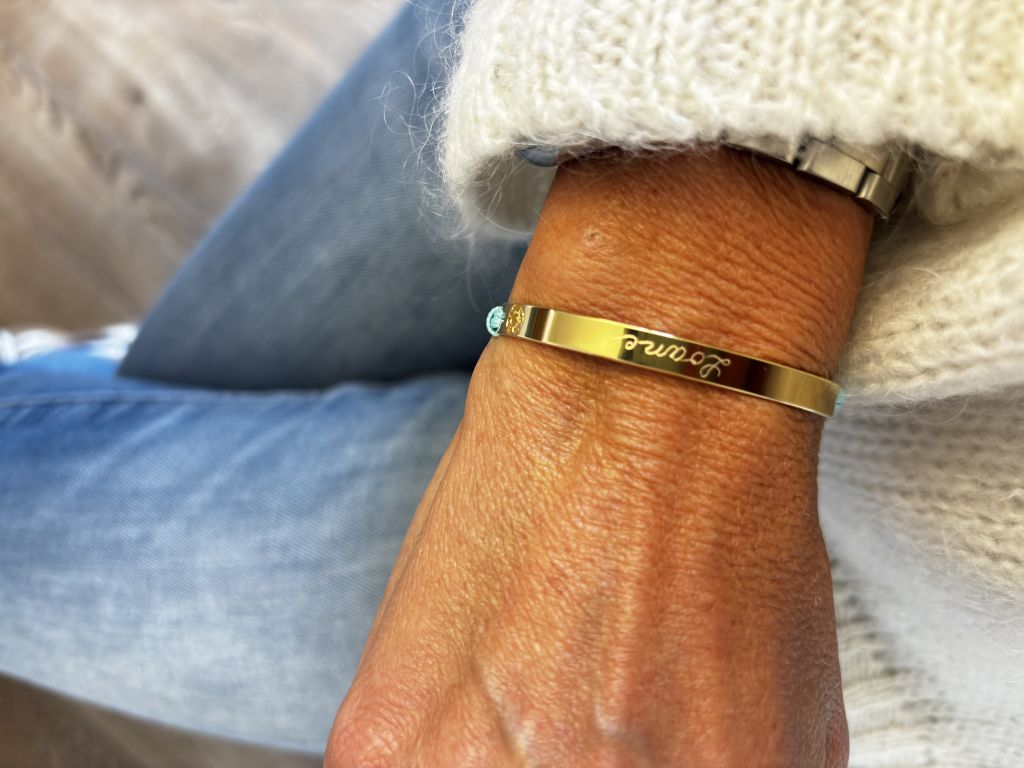 Bracelet demi jonc gravable . Finition 1 noeud coulissant perles