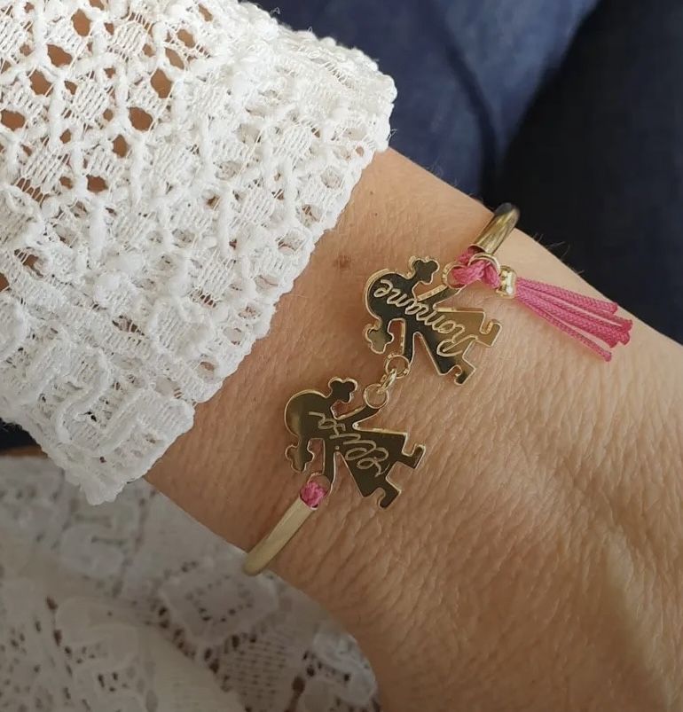 Bracelet demi jonc (nouveaux de 2025 plus épais et plus résistants) 2 personnages filles plaqué or pompon (coordonné à la couleur du polyester). Attention je n'ai plus de garçon en plaqué or