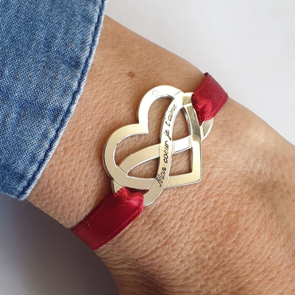 Bracelet coeur infini 23 x 32 mm, 1 mm d'épaisseur. Plaque légèrement incurvée afin d'épouser au mieux la courbe du poignet. Gravures sur mesures.