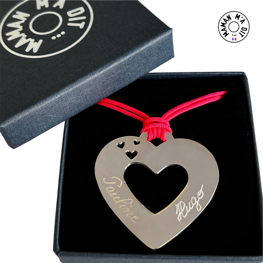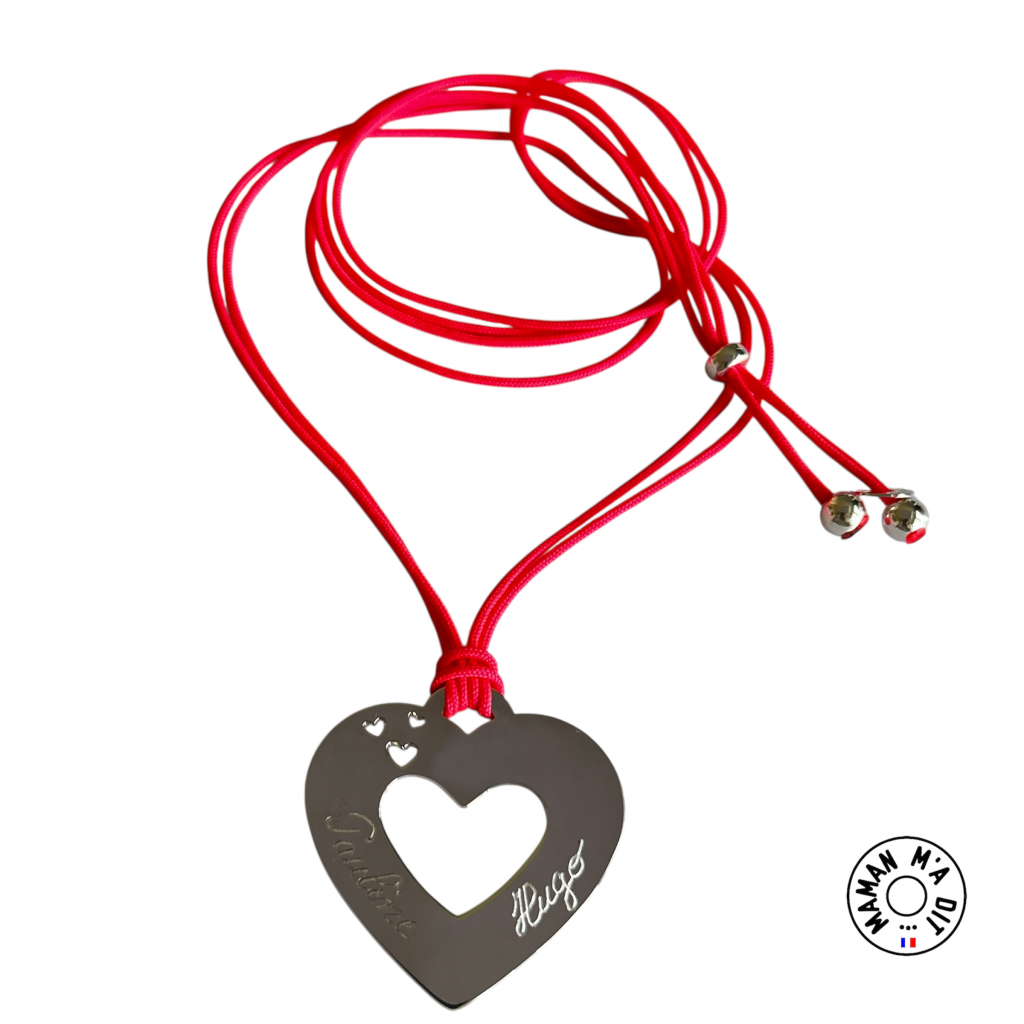 Collier médaille coeur 35 mm (modèle déposé), petits coeurs ajourés. Gravures offertes. Montage sur cordon polyester 3 perles avec supplément