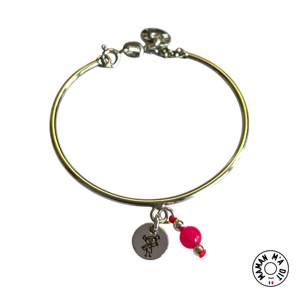 Bracelet jonc enfant 5/10 ans (diamètre 45 ajustable) avec mini médaille fille et pompon couleur au choix