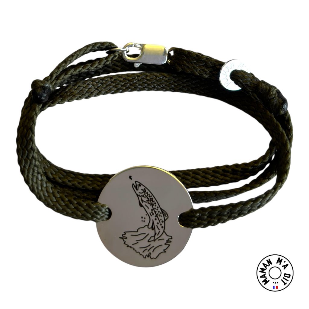 Ce bracelet raffiné associe élégance et passion pour la nature. Son médaillon 24 mm en argent massif est finement gravé d’une truite sautant hors de l’eau, symbole de liberté et de vitalité. Le cordon tressé de couleur kaki, à la fois résistant et confortable, apporte une touche d’authenticité et de modernité.