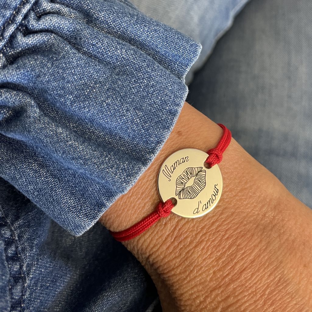 Bracelet jeton 20 mm empreinte bisou et gravures au choix. Gravure noircie en option