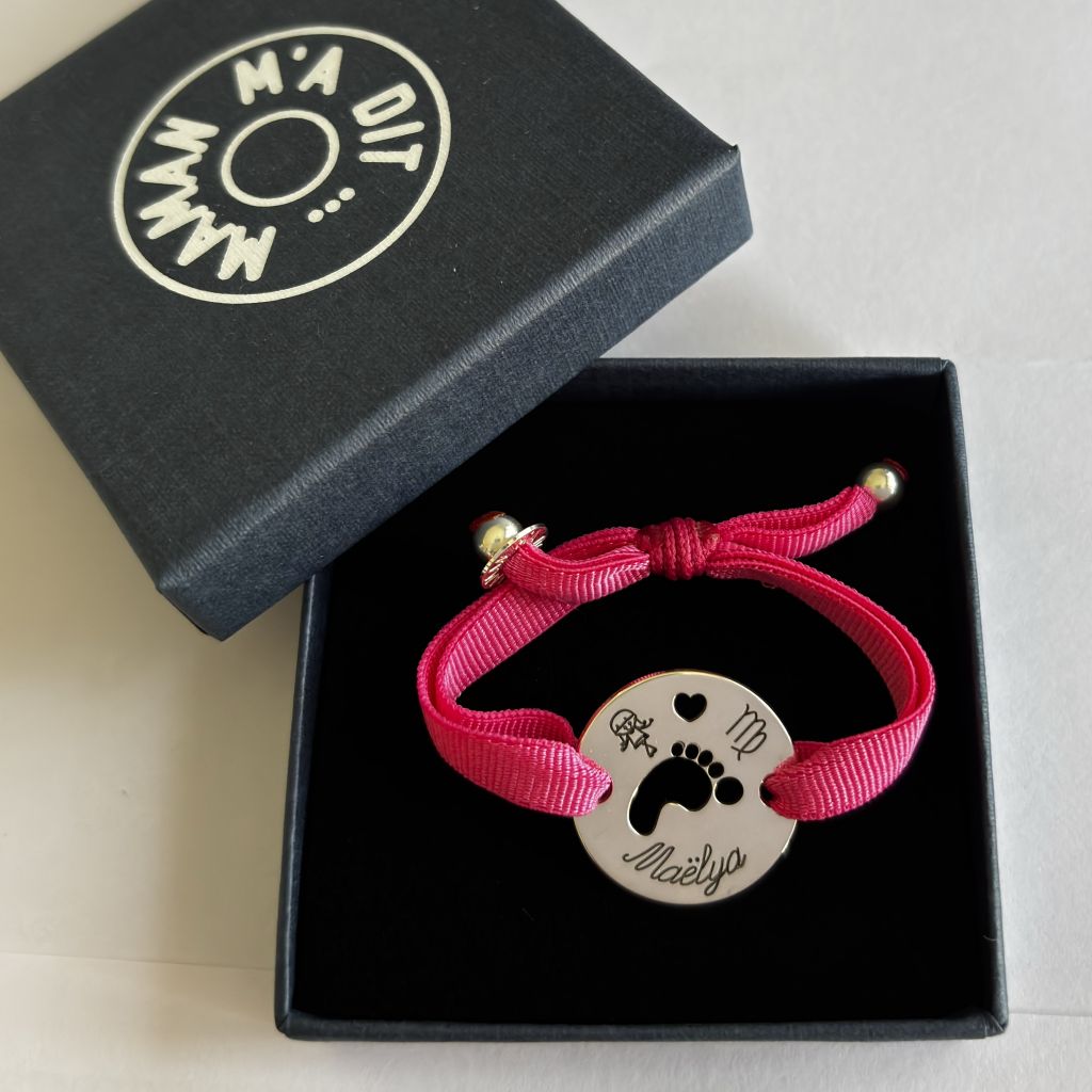 Bracelet jeton 20 mm,, médaille de naissance avec empreinte pied bébé, coeur ajouré et personnage, signe astrologique et prénom au choix.. gravures noircies comprises